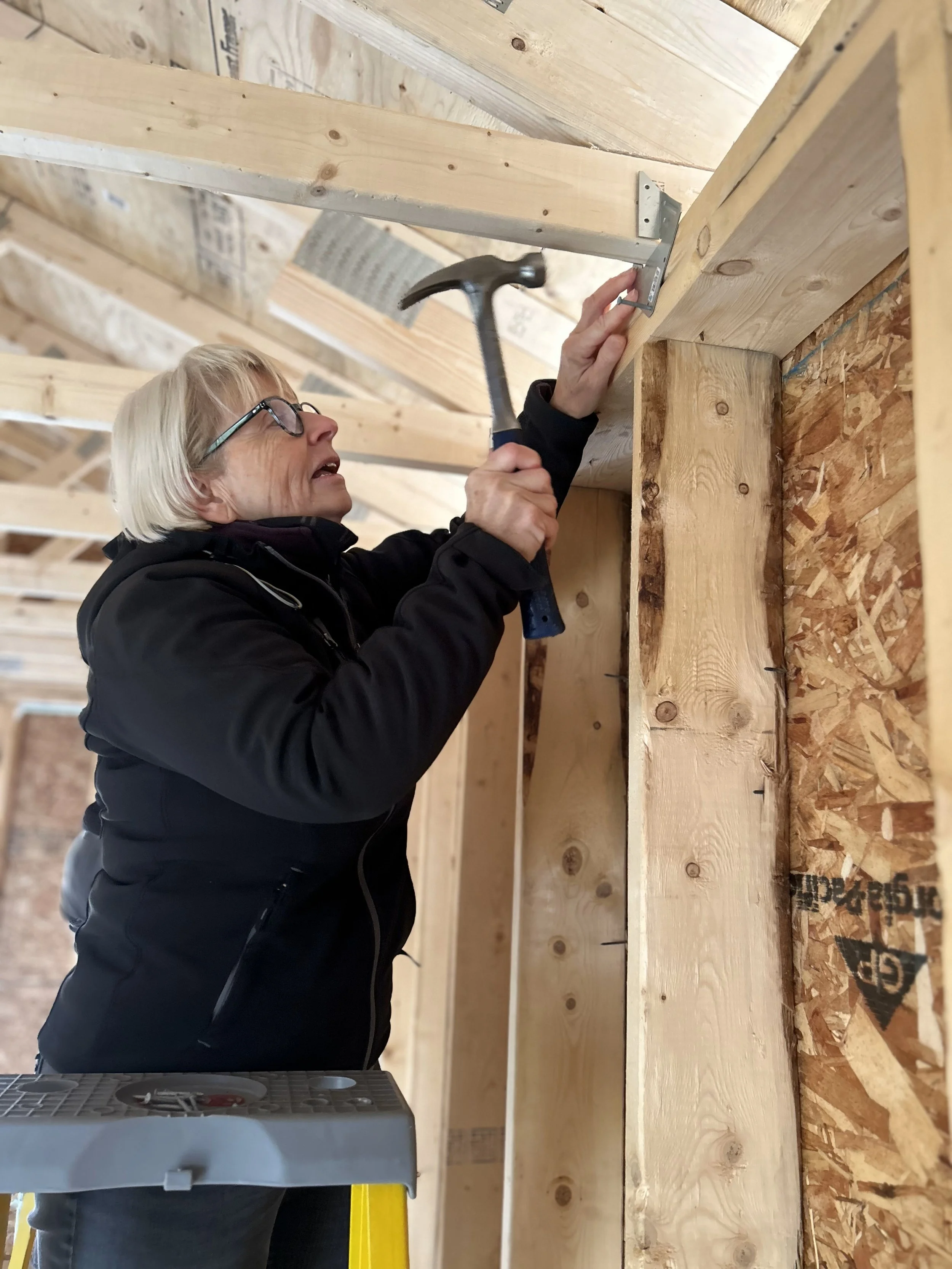 2: Shed Workshop participant Carol Gilbert helps secure the roof trusses to the shed.
